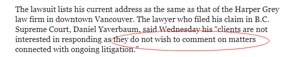 直到去年,张同才意识到自己被骗了。如今他没有透露自己在大温居住何处,诉讼书显示的当事人住址实为温哥华市中心Harper Grey律师事务所的地址。