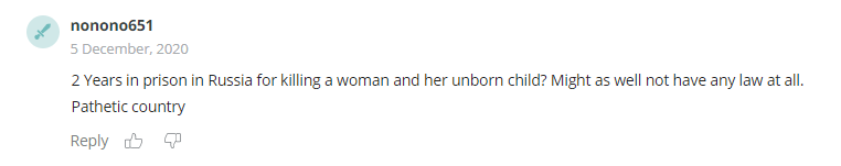 “如果在俄罗斯杀害一名妇女及其未出生的孩子才入狱2年?那这个国家可能根本没有任何法律吧?”