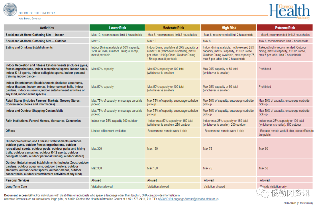 俄勒冈州卫生局每周检查并发布各县风险级别数据,每两周调整一次风险级别。