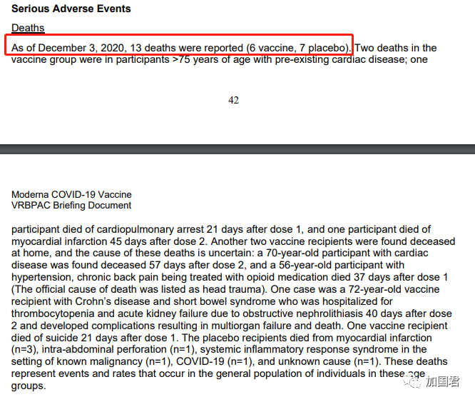 根据报告,在测试过程中,共有13人身亡,其中6人来自疫苗组,7人来自安慰剂组别。