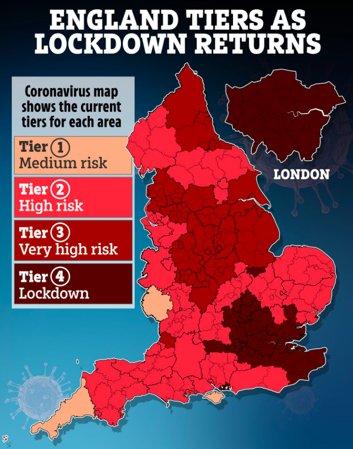 英国防疫等级示意图,颜色深最深区域为四级封锁区域,以伦敦和周边城市为主。