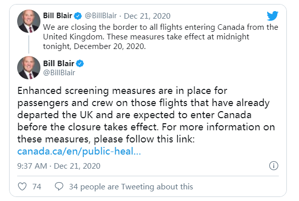 交通部长Marc Garneau称,"采取该行动是为了维持航空安全以及保护加拿大人的安全。" 虽然最初有高级官员称将禁止英国航班措施的时限设置为72小时,但公共安全和应急部部长Bill Blair发推表明,如有必要,将不排除无限期禁止英国航班入境,直至英国"整顿"好为止。