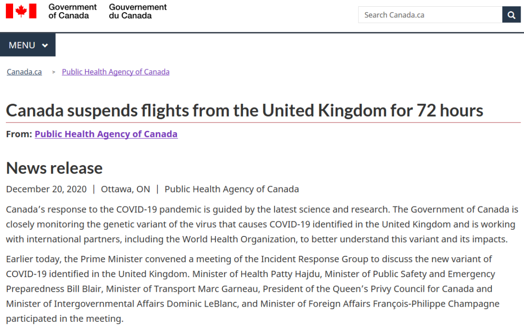 加拿大交通部的一份通知中表明,从20日午夜起,所有来自英国的入境航班包括商业、私人和包机航班都将暂停入境。(该限制不适用于货运航班。)