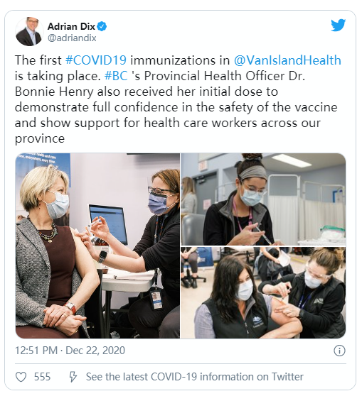 关于疫苗的分配,现BC省五个卫生部门 都已收到疫苗并按照优先次序安排接种 如今首批接种者为第一线卫生保健者 然后是长期护理院的居民和其他优先人群