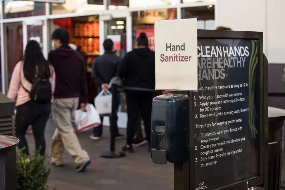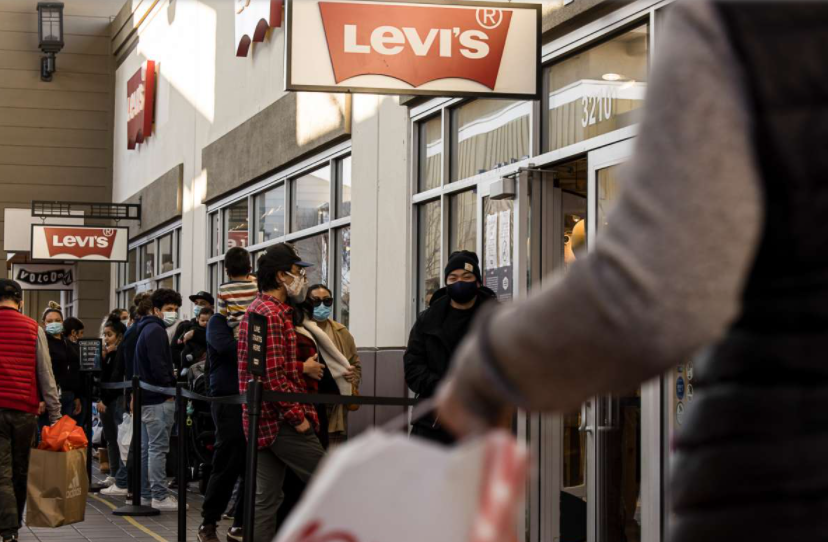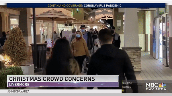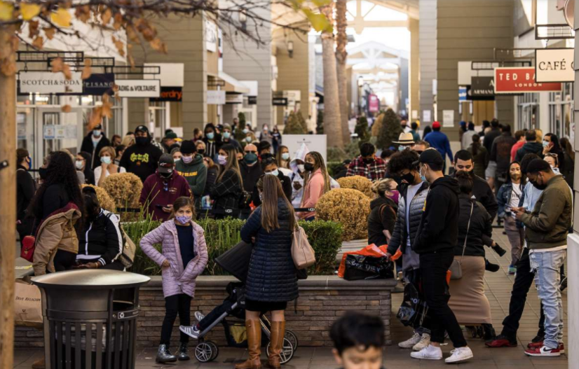 周一,在距离旧金山市中心40英里的大型奥特莱斯购物中心挤满了人。