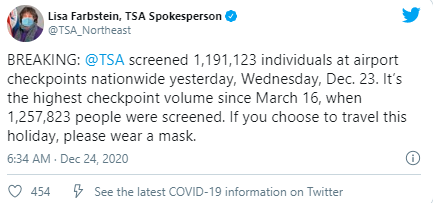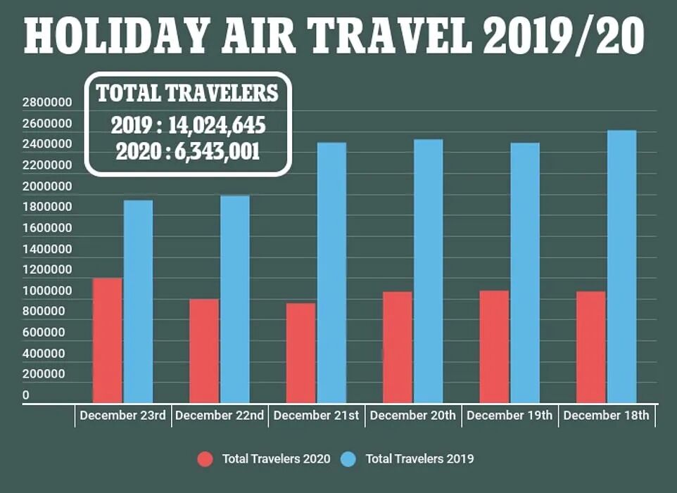 根据美国运输安全局TSA统计,圣诞前夕,有超过500万登上飞机出游,创下3月疫情爆发以来最大的航空旅客数量。