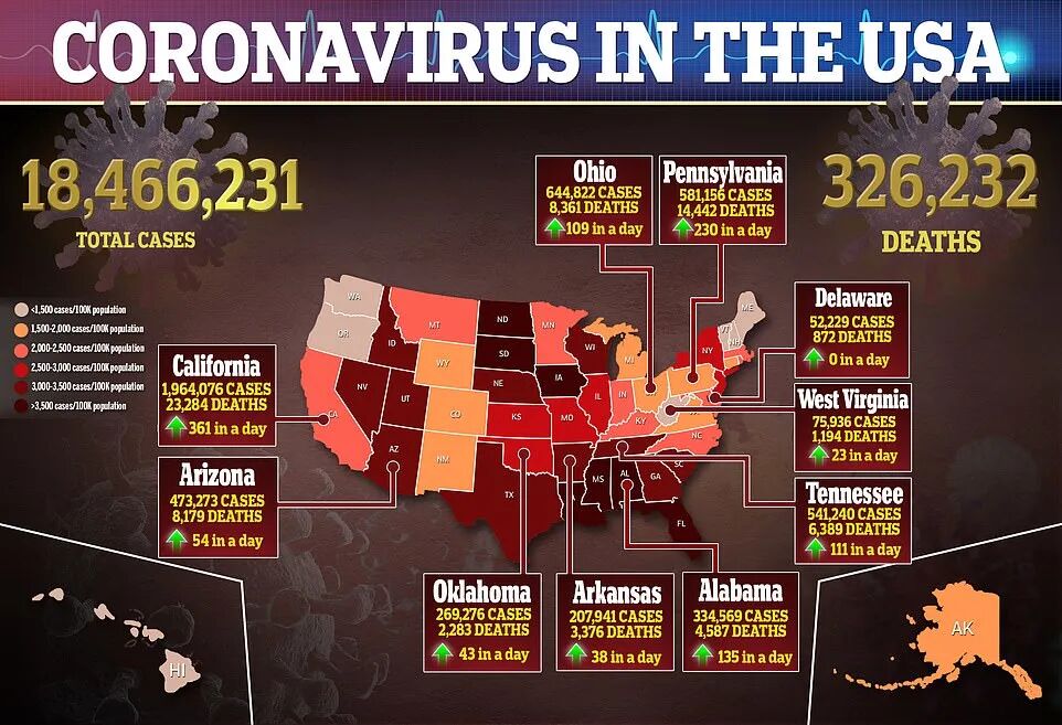至今,美国累积已有32万人死于新冠病毒,确诊人数为1840万