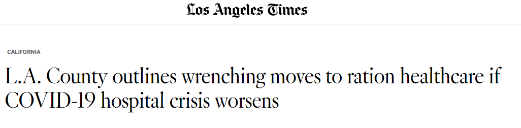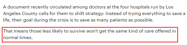 最近洛杉矶县的四家医院中的医生传阅的一份文件呼吁:在危机期间,他们的目标不是尽一切努力挽救生命,而是要挽救尽可能多的患者。