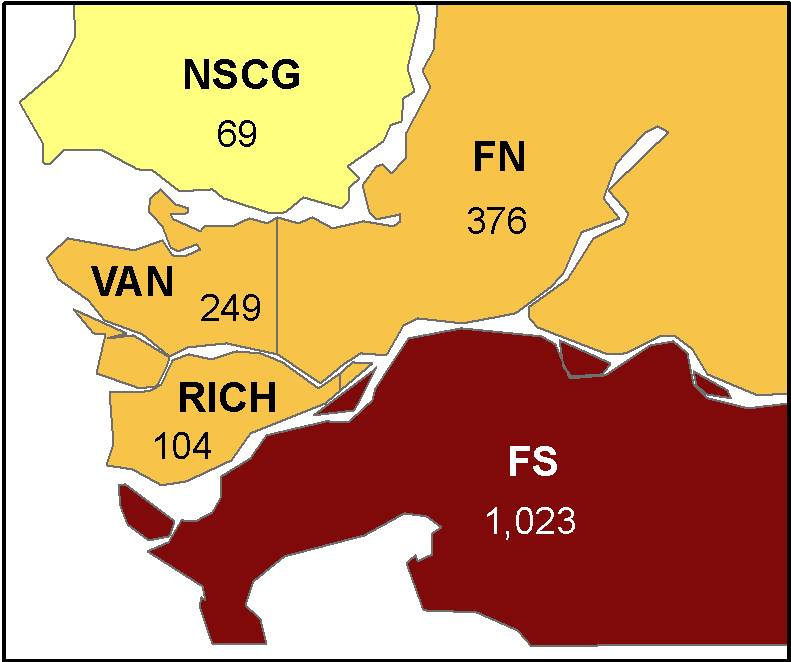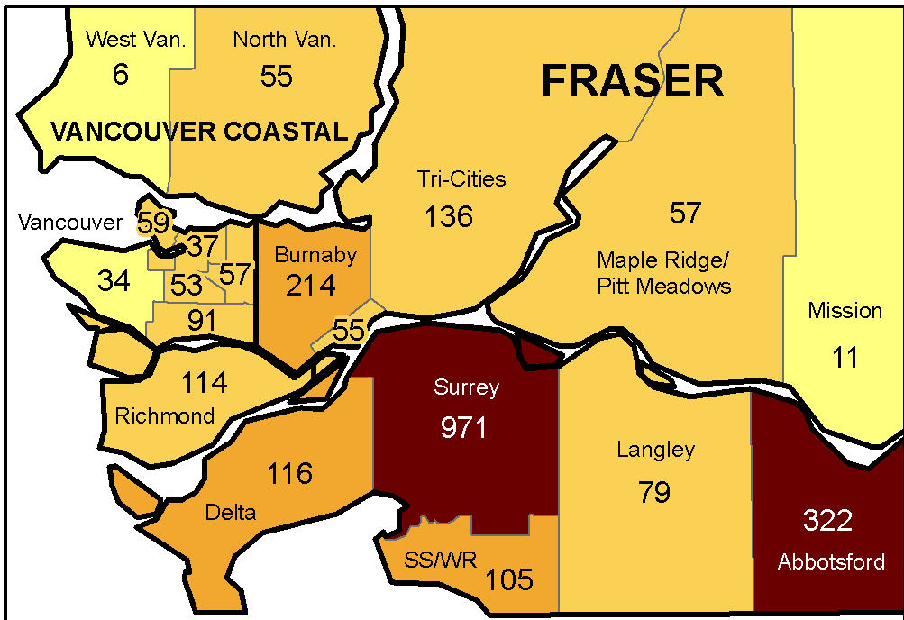 温哥华331例;阿伯茨福德:322例;本拿比214例;三联市136例;三角洲116例;列治文114例;南素里/白石:105例;枫树岭/彼特草原57例;新西敏55例;北温55例;米逊:11例;西温6例。