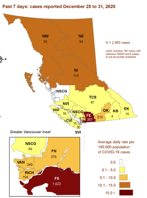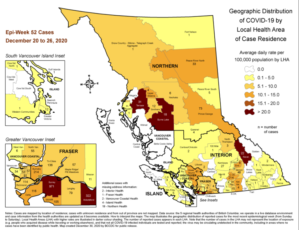2020年最后一天,BC省仍然确诊683例,不过根据最新BC 疾控中心的数字显示,各个地区的确诊病例上一周(12月20日至26日)有所回落。