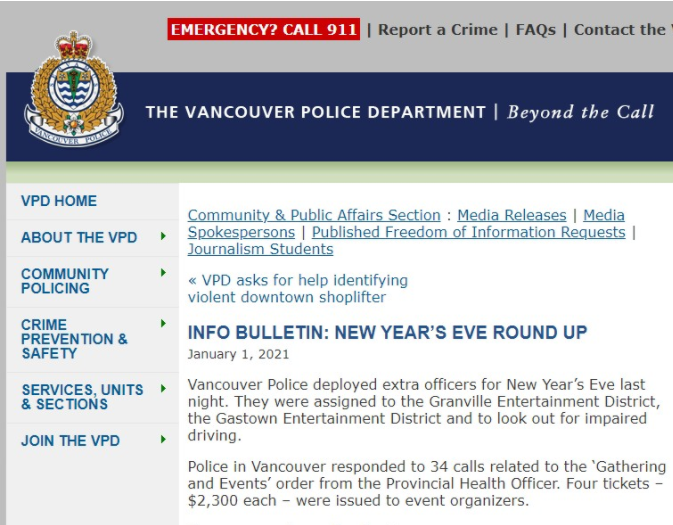 在2020年12月31日晚上11点,温哥华市警接到投诉电话,指格兰护街(Granville)夹戴维街(Davie streets)附近一家餐厅有人关上门举行的私人派对。
