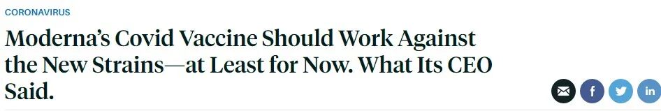 该公司的CEO Stéphane Bancel表示,经研究发现,Moderna疫苗极大可能能够适用于英国和南非出现的新冠变种病毒。他表示:“如果病毒继续突变,则可能导致疫苗在一年至两年内失效,但我们将迅速开发出一种新的疫苗,和之前的疫苗同时进行注射。”
