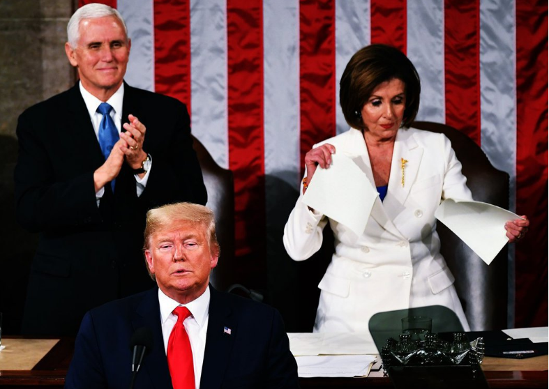美国总统川普面对国会二度发动"弹劾表决"的终极挑战。图为2020年2月,川普国情咨文事件。图/法新社