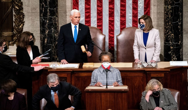 美国国会被暴力闯入后当日恢复秩序,副总统彭斯与议长佩洛西主持参众两院联会(路透社 1月6日)
