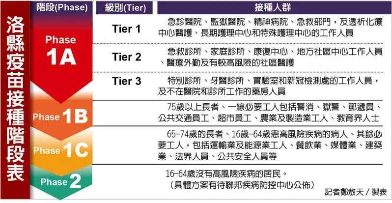 洛杉矶县的新冠疫苗分配细节顺序已经公布,接种对象已经不再限于部分第一线医疗人员。 洛杉矶公共卫生部门称,本县目前处于疫苗推广的1A阶段,这意味着只有医护人员和熟练的长期护理人员才有资格接种疫苗。