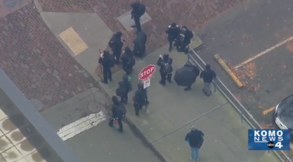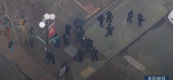 示威活动最初从下午4点30分左右开始,一小撮人聚集在117 S. Washington St,随后一起穿过西雅图市中心街道。