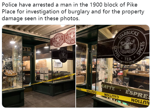 2人涉嫌破坏第六大道William Kenzo Nakamura法院大楼,Amazon Go商店以及派克市场标志性第一家星巴克被捕,另一名女子涉嫌袭击事件被捕。