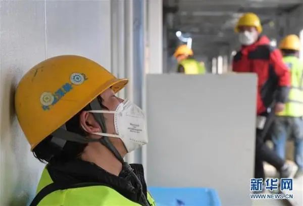 2020年2月3日,一名疲惫的工人在武汉火神山医院工地一处正在施工的病房外小憩。新华社记者 李贺 摄