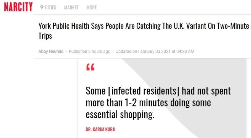 另外,当地的“闪高马斯科卡卫生局”(Simcoe Muskoka District)已经将有关的官方说明做了修改,将B117变种病毒的“可能发生感染的最短曝露时间”缩短至60秒。