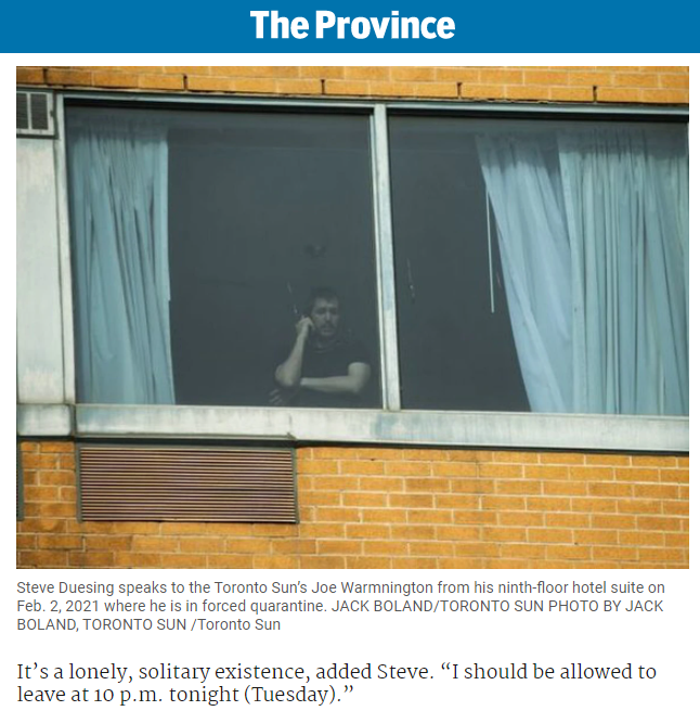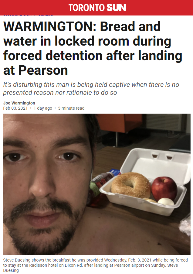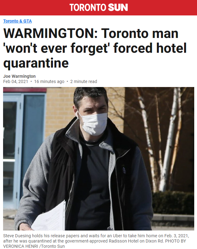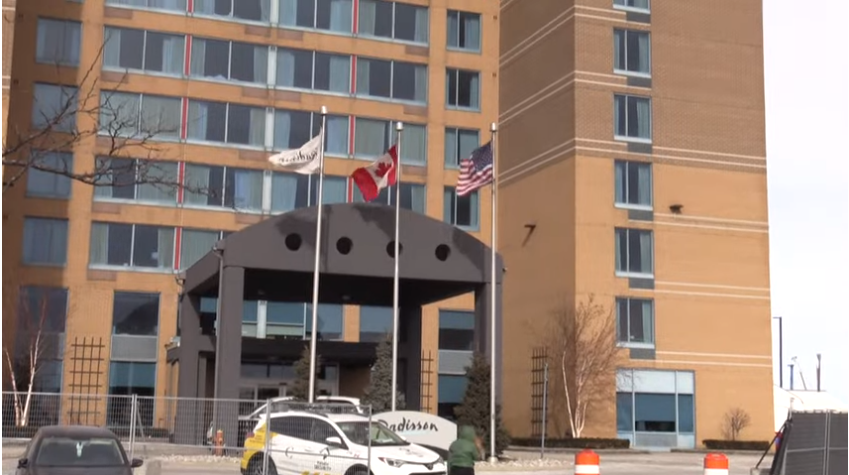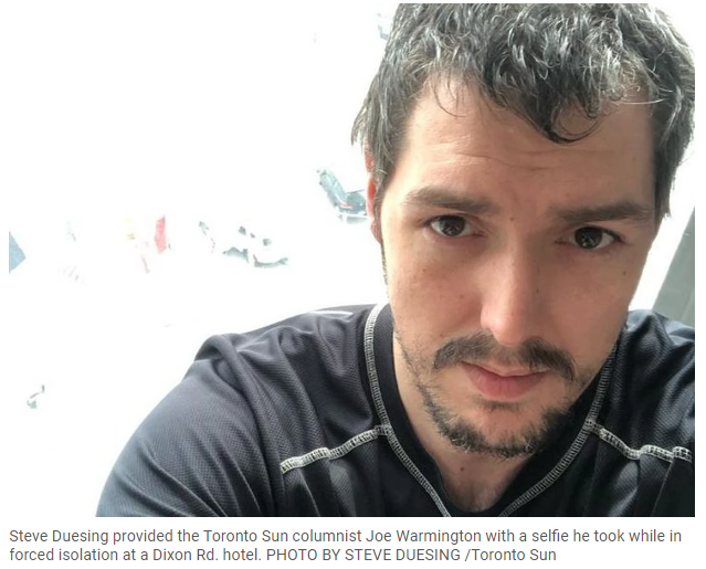 于是,在机场接受强制核酸检测后,当天晚上,史蒂夫在警察的陪同下,乘坐专车,从皮尔逊机场,到达了附近的Radisson Hotel,被送至酒店9楼的一个房间,开始了漫长的等待。