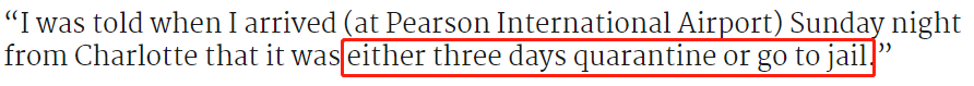 首先,在加拿大机场,该小伙称,他被机场官员威胁,如果不接受3天酒店集中隔离,就要被送进监狱;