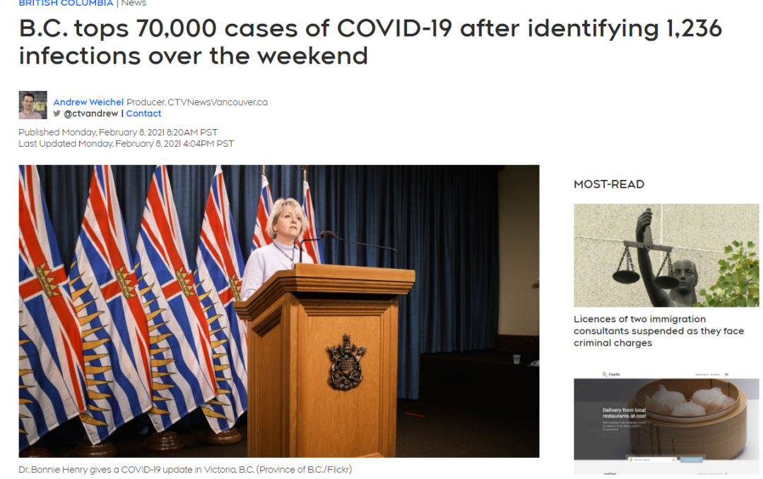 BC省首席卫生官亨利医生 (Dr. Bonnie Henry)周一 (2月8日)宣布, 上周五至周一,全省共新增 1,236例新冠肺炎病例, 令确诊总数增至70,952例; 新增13人死亡, 死亡总数增至1,259人。