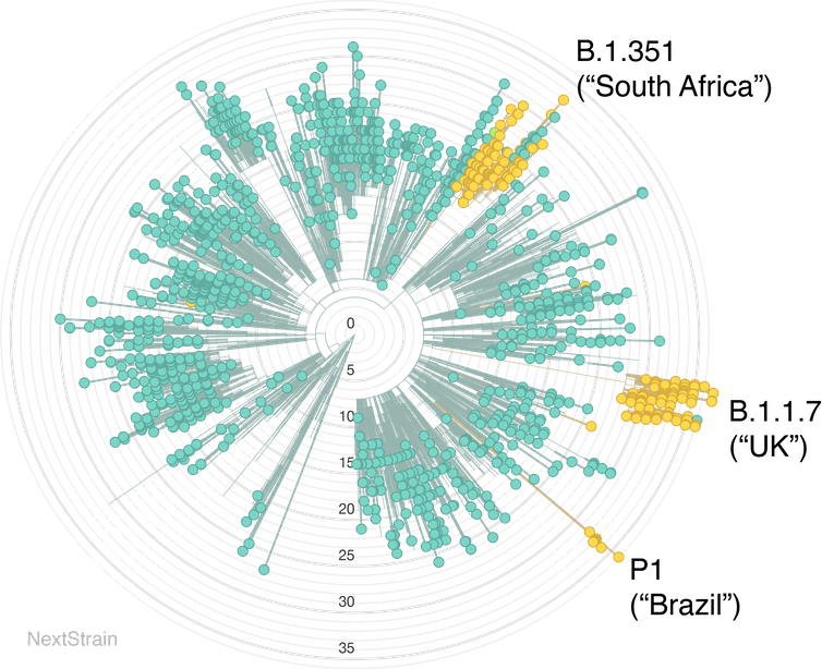 目前的主要变种病毒大患有三: 南非B1351、英国B117和巴西P1。