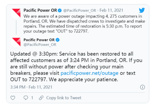 今天下午3:30,波特兰通用电气,太平洋电力,和克拉克公共事业都报告停电。然而,在一个小时内,太平洋电力公司报告说,对所有4000多名客户恢复服务。