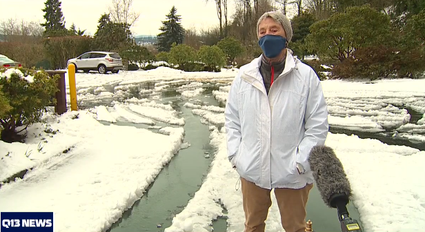 由于外面路况极差,开车太危险,Goldman周六决定从西雅图家中沿着Burke Gilman步道走去医院打疫苗。