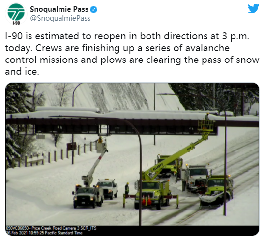 根据最新评估,WSDOT宣布I-90双向车道会在下午3点左右重新开放。