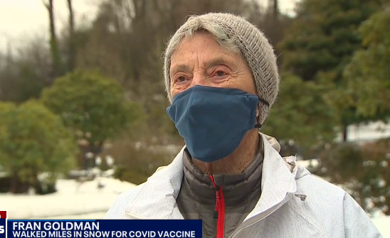 一名90岁西雅图女子Fran Goldman在上周末西雅图暴风雪中徒步6英里,来确保自己能够准时出席梦寐以求的COVID-19疫苗接种预约。