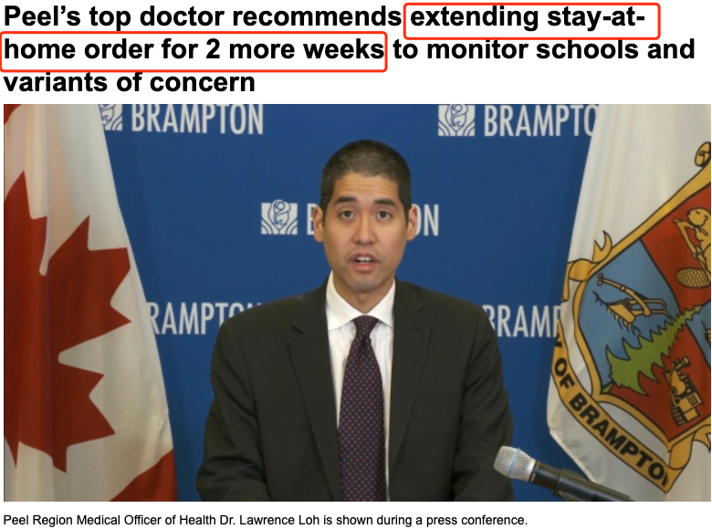 除了多伦多,皮尔区首席卫生官要求继续封城至少2周,要求省府不要取消区内居家令。以评估学校重开以及区内出现高传染性的病毒变体。