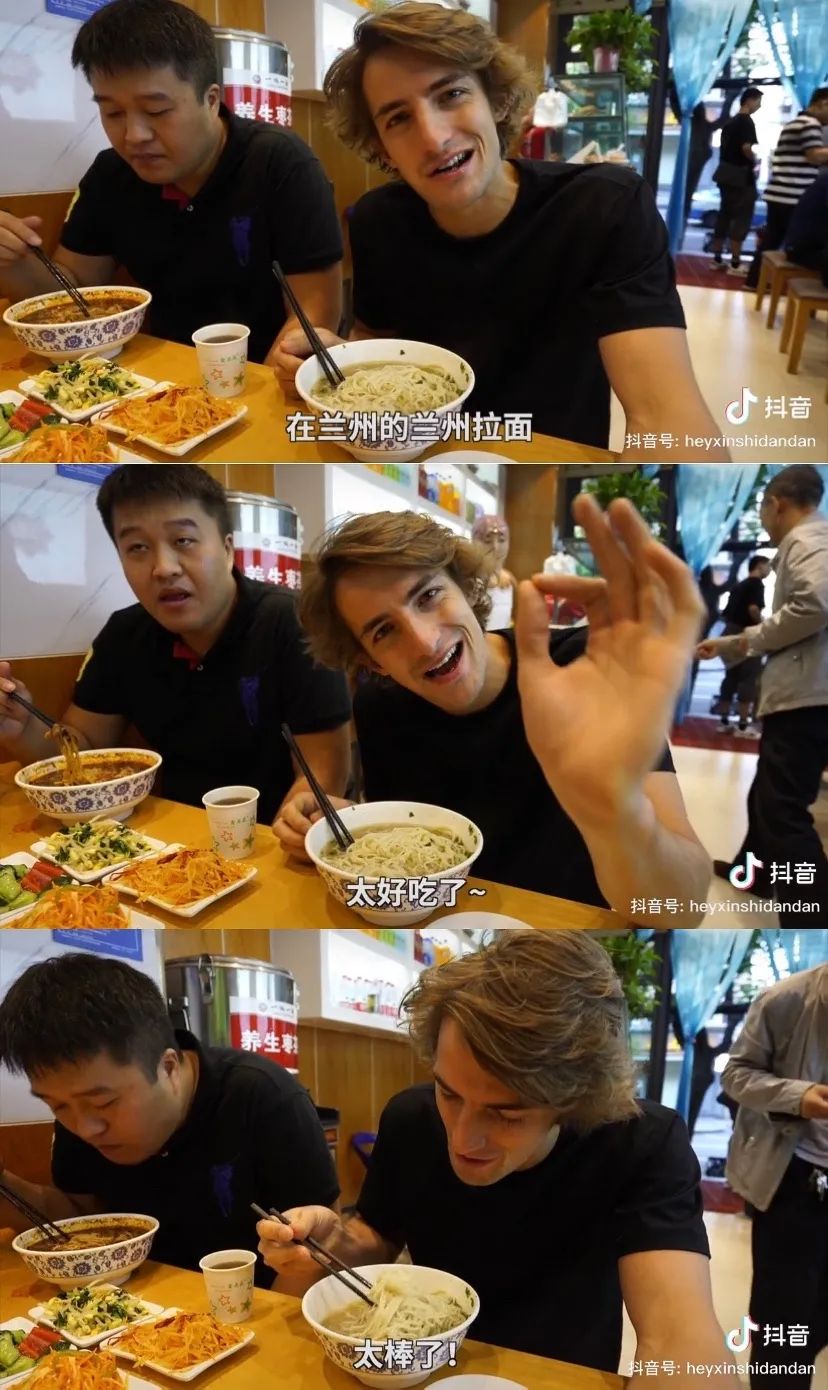 兰州拉面上桌,薄薄的牛肉,翠绿的葱花,鲜美的汤,外国小哥感慨:在兰州的兰州拉面,太好吃了!