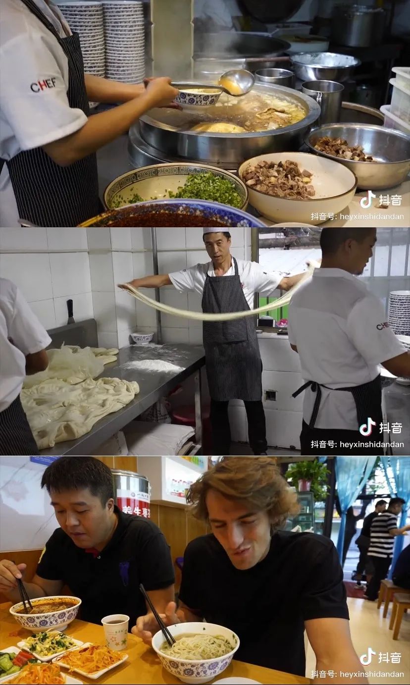 终于夜色中,他们抵达兰州,第二天直奔兰州拉面,还跑到了拉面师傅的后厨,热腾腾的高汤冒着热气,兰州拉面师傅在拉面条。