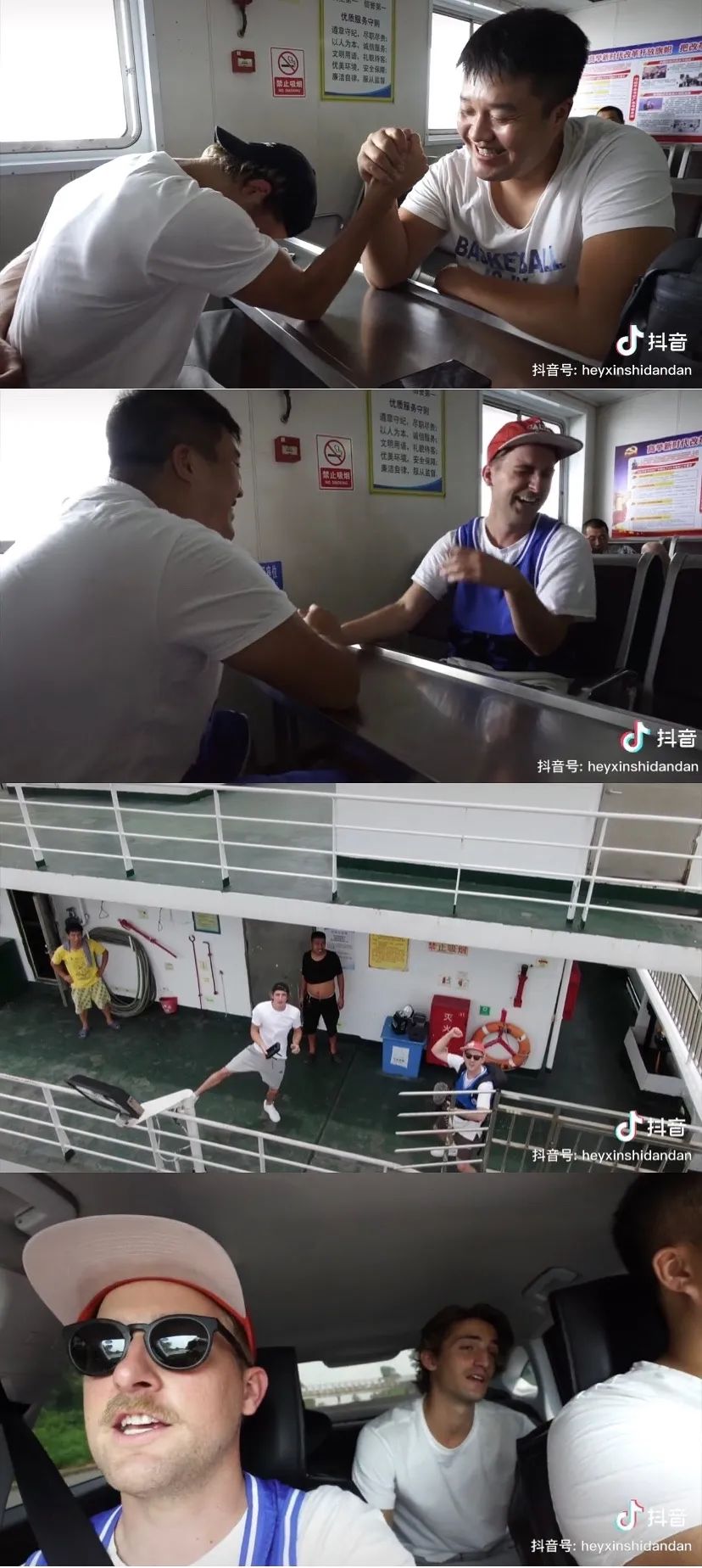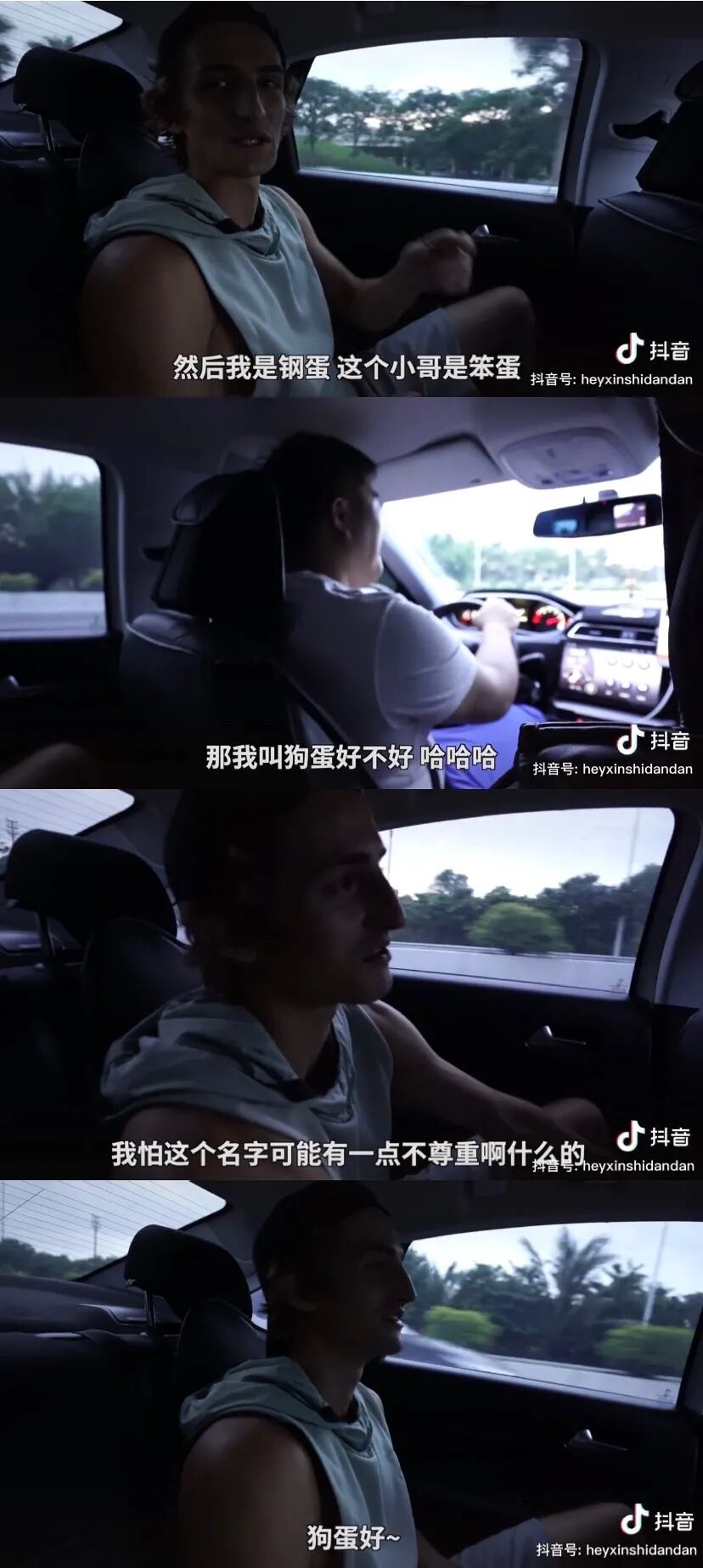 在车上三个人开始自我介绍,两个歪果仁中文名一个叫钢蛋,一个叫笨蛋,小哥开玩笑说自己叫狗蛋。
