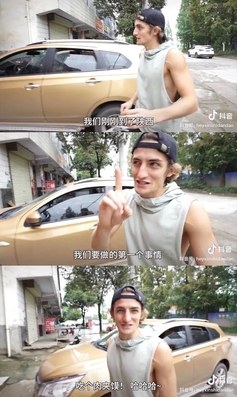 就这样慢慢抵达陕西,而到达陕西的第一件事,外国小哥是去吃一个肉夹馍。