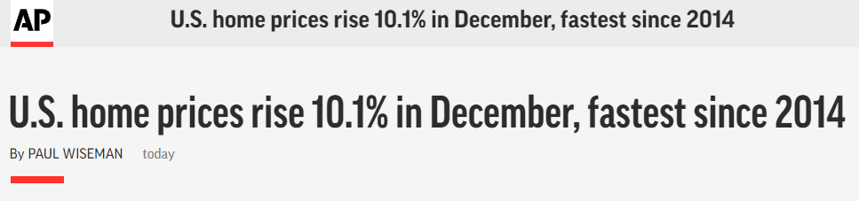 根据今日公布的标普CoreLogic Case-Shiller,去年12月的20个城市房价指数(S&P CoreLogic Case-Shiller )较上年同期上涨10.1%,这是自2014年4月以来的最大涨幅,去年11月的同比涨幅为9.2%。