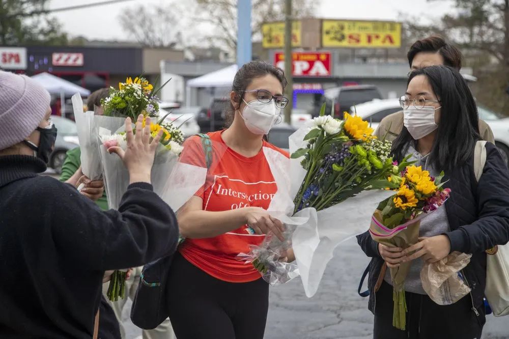 在案发的按摩中心外,人们献上鲜花、举起标语以支持亚裔社区。