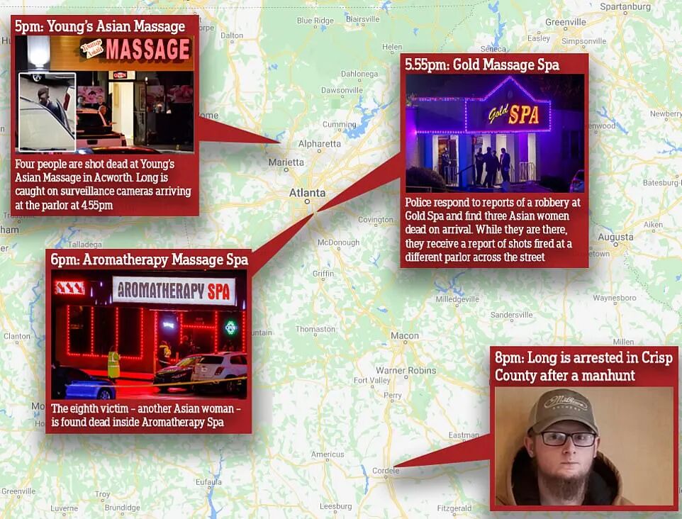 3月16日,下午5点,21岁的枪手接连闯进亚特兰大地区Acworth附近3家水疗按摩店,一进去就乱枪扫射,导致8人死亡,其中6名都是亚裔。