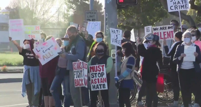 周四,大约100人聚集在东湾奥尔巴尼最繁忙的十字路口之一,谴责反亚裔仇恨犯罪。