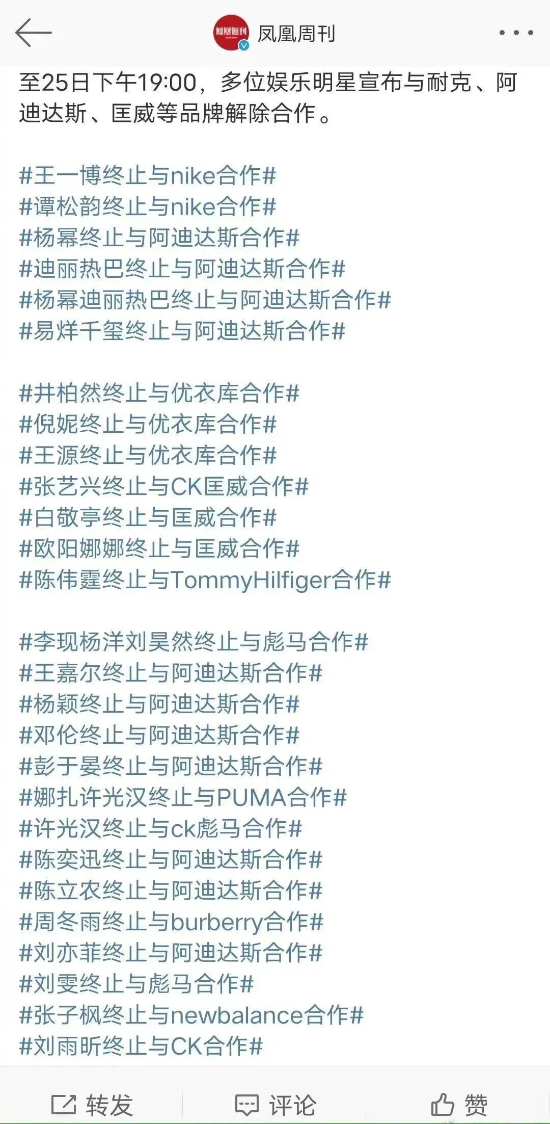 坚决抵制任何污名化中国的行为,即日起终止与adidas品牌的一切合作。