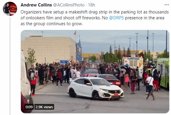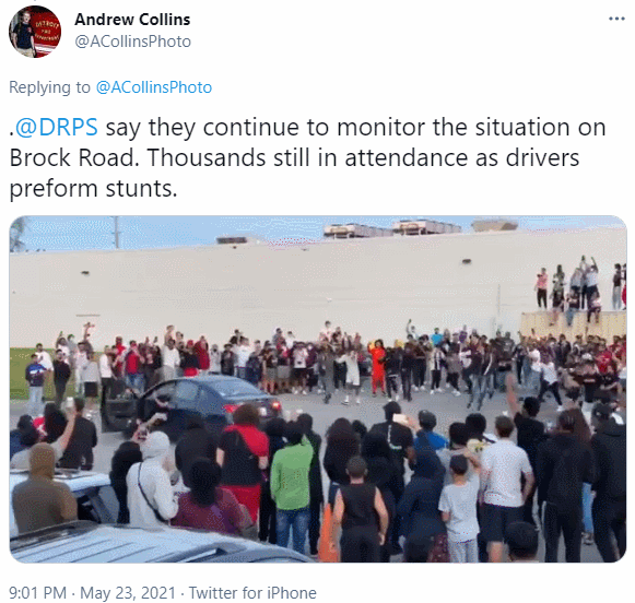 上传视频者表示,“数千名汽车爱好者聚集在Pickering看大型汽车集会表演,杜兰区警方说他们正监视着这个情况的发展,但附近没看到有警察出现。”