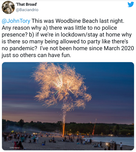 而这个Victoria Day长周末,随着安省解封户外,更多年轻人涌向了多伦多市的Woobine Beach和Cherry Beach。他们尽情狂欢,继续不戴口罩,不保持距离:(请看下面来自推特网友的图片)