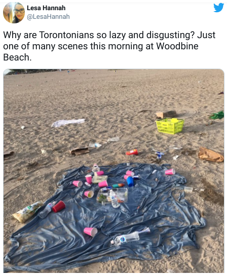 还有网友在今天早上来到Woodbine Beach后发现沙滩上满是垃圾,她拍下照片并表示,“为什么多伦多人这么懒又令人反感?这就是今天早上我在Woodbine Beach沙滩上发现的其中一幕。”
