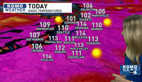 气象学家约翰尼·伯格表示,108华氏度的记录是周一下午6点在Sea-Tac机场创下的,这是自1945年以来西雅图最高的温度记录。