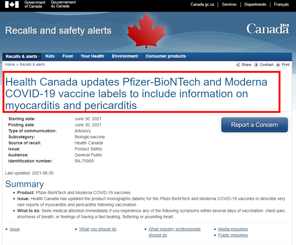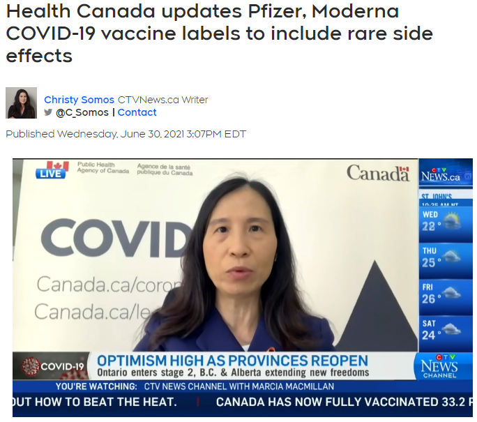 6月30日,加拿大卫生部更新了辉瑞和Moderna疫苗的标签,包括接种疫苗后出现罕见心肌炎和心包炎的信息,以及其相关副作用。
