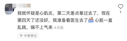 “我怀疑自己是心肌炎,第二天差点晕过去了,直到第四天还没有好转,心脏一直乱跳,喘不上气,准备去看医生了。”