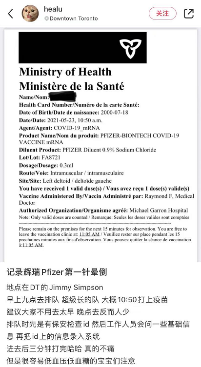 还有一个多伦多的华人妹子,在DT打完第一针辉瑞后也当场晕倒!