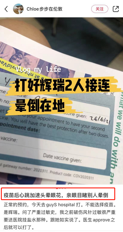 据一名住在伦敦的华人网友透露,自己在接种完辉瑞疫苗后出现了心跳加速、头晕眼花的症状,但这一症状大概在25分钟后就缓和了。可怕的是,跟她同一时间接种的两名强壮的大哥,却接连晕倒了。