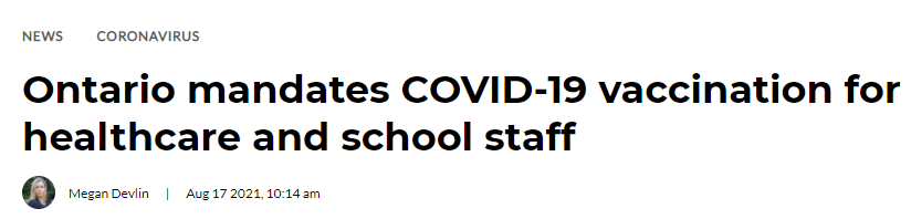 8月17日,安大略省首席医生宣布,医疗和教育部门的雇主必须在下个月之前为他们的员工制定疫苗接种政策。